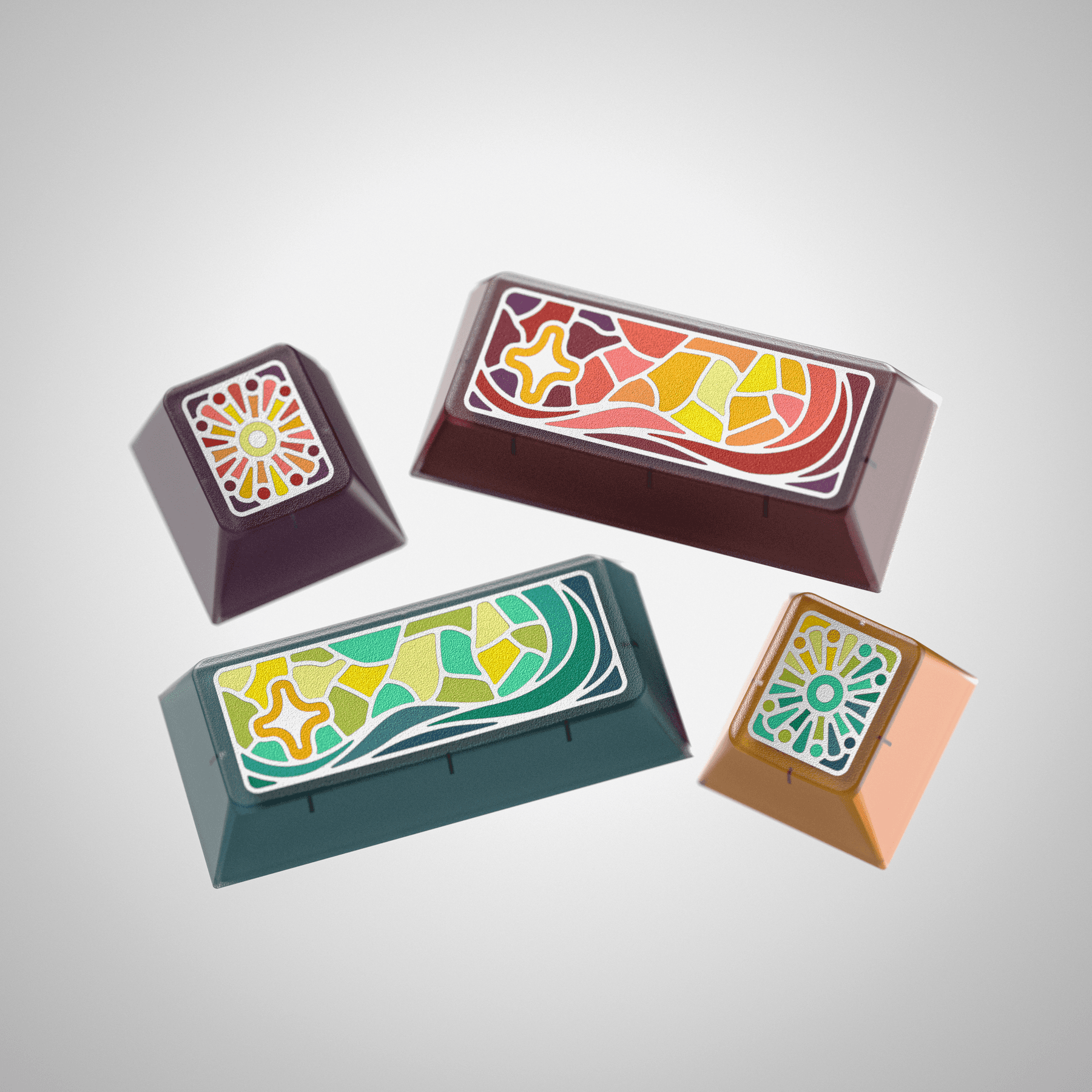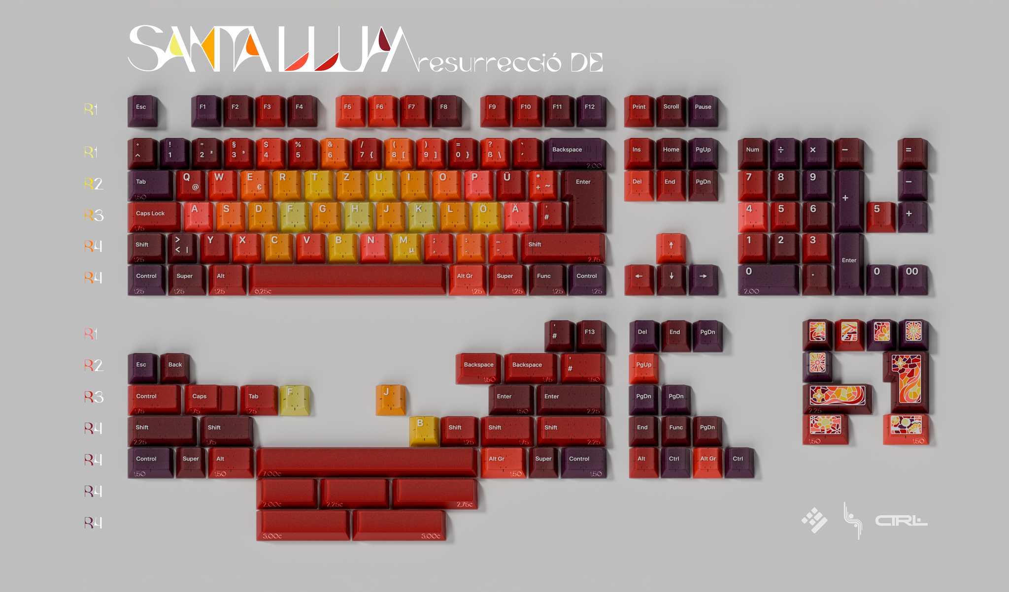 The KAP Santa Llum Resurrecció Base Kit is an artfully designed custom keycap set from Keyreative , inspired by the warm hues of evening light filtering through the stained-glass windows of Barcelona's Sagrada Família . Where the Naixement set captures the dawn, Resurrecció represents the transition from day to dusk, bringing a harmonious palette of deep reds, rich ambers, and vibrant purples to your keyboard. The combination of double-shot ABS legends and UV-printed novelties creates a visually rich and colorful experience, especially striking on backlit keyboards. The classic Cherry MX (KAP) profile ensures a comfortable typing feel, while the themed design adds a distinctive personality to any custom keyboard build.