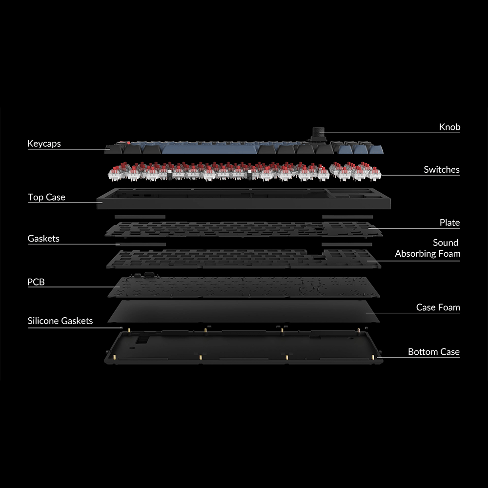 • Mounting design: Gasket or double damping ("Double Gasket Design") to reduce resonance in the housing and improve typing feel.